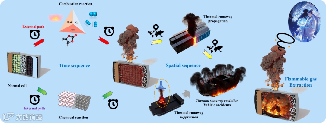 随着电动交通工具、储能电站及消费电子产品的快速发展及应用,锂离子电池在安全性方面逐渐显现不足,事故频发。其中,锂离子电池在热失控及其系统蔓延过程中,常出现延期喷发、燃烧及爆燃的问题,带来了显著安全隐患。为了解决这些问题,研究者们提出了通过材料改性、主动安全预警、被动安全隔热等防护手段,从“燃烧三要素”的角度抑制热失控及其蔓延行为,从而提升锂离子电池的安全性。