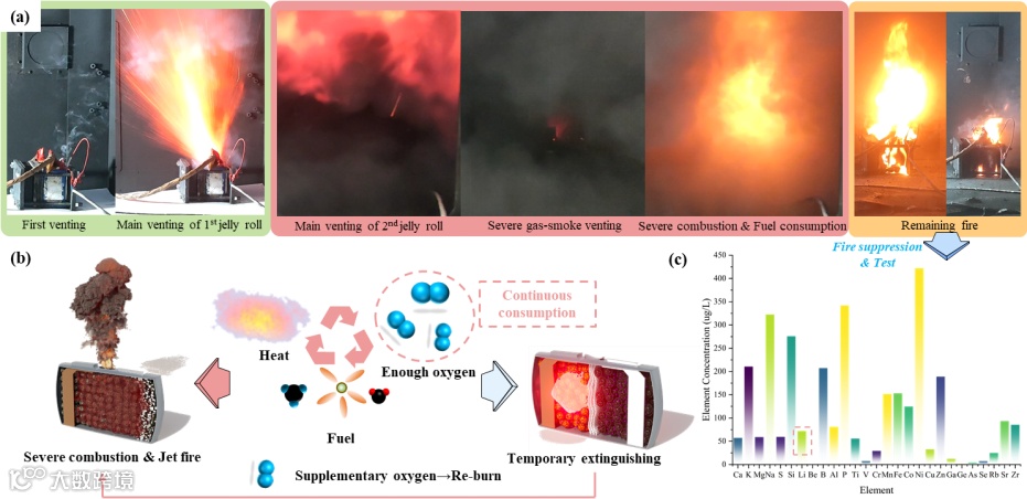 本文从可燃气体、氧气的角度对热失控危害和“复燃”现象进行了评估,提出了火焰诊断方法和“余烬”判断标准(火焰高度<电池高度)。剧烈燃烧过程中氧气的消耗会导致火焰的短暂熄灭,无喷射火产生。进一步,本文基于电感耦合等离子体光谱仪分析发现:浸入极片中的大量电解液在稳定的喷发和喷射火后为“余烬”现象提供燃料,对邻近的未触发电池构成威胁。