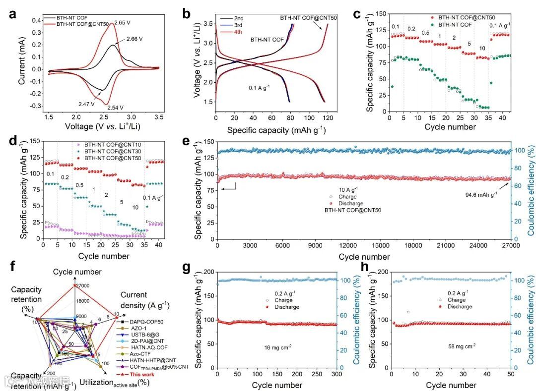 BTH-NT COF材料通过丰富的氢键网络和独特的酰肼结构,展现出优异的润湿性、柔性和稳定性。BTH-NT COF@CNTx(x=10、30、50)复合材料形成的独特"核-壳"结构,有效促进了活性位点暴露和离子/电子扩散转移效率。BTH-NT COF@CNT50作为锂电池正极材料展现出优异的倍率性能和超长循环稳定性,在10 A g−1稳定循环27000次,容量保持率高达95.6%,成为目前循环寿命最长的COFs基LIBs正极材料之一。
