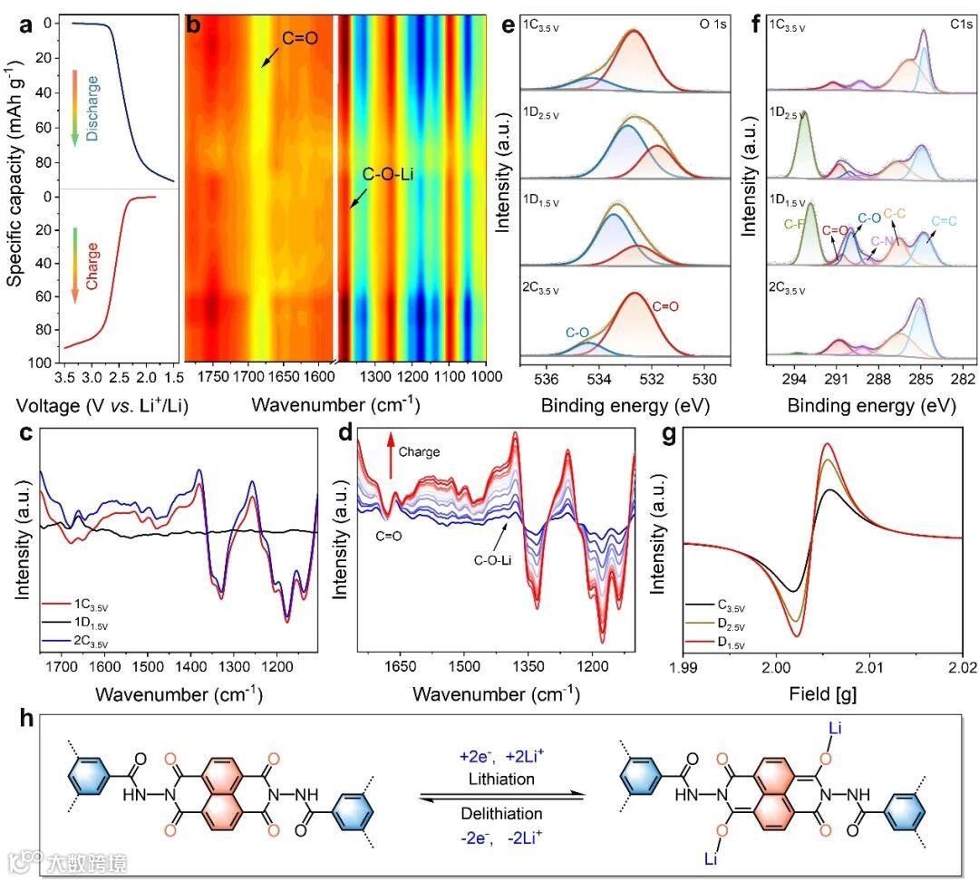 为阐明BTH-NT COF正极在充放电过程中的储能机制,本研究采用实验表征与理论计算相结合的研究方法,通过原位/非原位红外光谱(in-situ/ex-situ FT-IR)、电子顺磁共振波谱(EPR)和X射线光电子能谱(XPS)等测试手段,结合DFT理论计算及模型COF的电化学验证,系统揭示了其储能机理。研究表明,萘环结构中C=O基团作为Li+的存储位点,而酰肼结构中的C=O基团在电化学过程中未参与氧化还原反应。