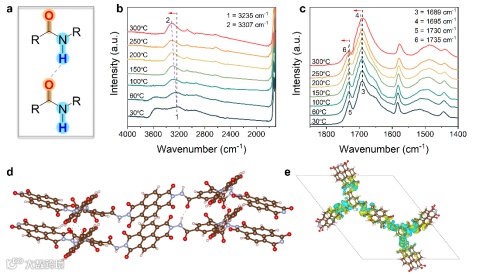 BTH-NT COF呈现出非完全共平面的空间结构,其骨架中的酰肼基团通过空间构象旋转为形成N-H···O=C层间氢键提供了可能。与共价键不同,氢键通常需借助室温傅里叶变换红外光谱(FT-IR)及苛刻溶剂条件下的稳定性测试等技术进行间接表征,而层间氢键的直接表征仍面临重大挑战。鉴于氢键会影响C═O和N─H官能团的FT-IR特征峰,且其相互作用强度受温度影响。因此,本研究采用变温红外光谱技术((VT-IR))对层间氢键进行系统表征,并结合密度泛函理论(DFT)计算,直接证实了BTH-NT COF中层间氢键的存在。