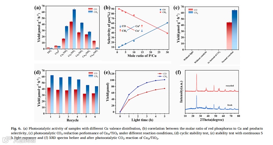 在模拟太阳光下,对复合样品的光催化CO2还原性能进行了评价并伴随误差分析,结果如图6(a)所示。在TiO2表面负载Cu物种以后,Cux/TiO2光催化CO2还原的性能得到了巨大的提升。最佳样品Cu3/TiO2的CO和CH4的产率为44.40μmol·g-1·h-1和64.44μmol·g-1·h-1,分别是纯TiO2的20倍和54倍,其中CH4的选择性高达86%。对选择性和磷铜比进行了线性拟合分析,结果如图6(b)所示。CO和CH4的选择性均与磷铜比呈线性相关且相关系数R2为0.9956。接近于1的线性相关系数说明不同Cu物种的组分对产物选择性具有决定性的影响,同时证明Cu0和Cu+分别作为生成CH4和CO的活性位点。图6(c)显示了光催化CO2还原过程的变量对照实验结果,表明产物中的C元素来源于CO2。对样品进行了循环和长期稳定性测试,结果如图6(d)和(e)所示。Cu3/TiO2在前四次循环中均保持了良好的稳定性,在第5次循环后性能有所下降,可能原因为低价Cu物种在光催化反应中被氧化为Cu2+,从而导致性能的降低。图6(f)显示了循环反应前后的样品的XRD图谱,可以看到属于TiO2的峰没有发生明显的变化。