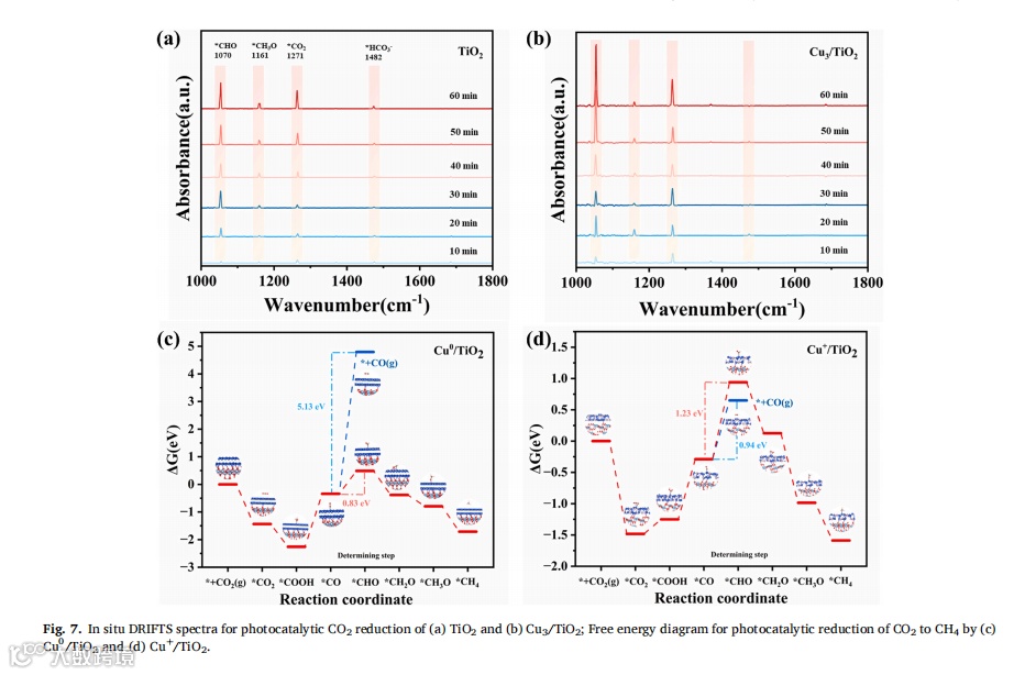 使用原位红外光谱(in-situ DRIFTS)探究了部分反应中间体在TiO2和Cu3/TiO2上的吸附和转化过程,以深入讨论可能的反应机理。如图7(a)和(b)所示,1482 cm-1处的峰对应于碳酸氢根(HCO3-)的特征振动,表明CO2和H2O的共吸附行为。1070和1161 cm-1处的峰分别来源于*CHO和*CH3O中的C-O伸缩振动,这两种物质是CO2光还原为CH4的关键中间体。值得注意的是,反应中间体在Cu3/TiO2上的峰强度显著高于同一时间范围内的纯TiO2,证实了Cu3/TiO2对CO2分子和中间体的良好吸附和转化能力。
