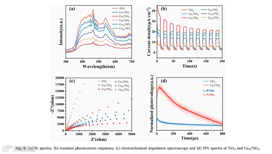 使用瞬态表面光电压测试(TPV)对样品的光激发以及光生载流子动力学行为进行了评价,结果如图5(d)所示。复合样品具有更高的峰强度,这意味着Cu物种的引入显著提升了TiO2的光激发能力,可以快速的产生大量的光生电荷参与反应。通过对样品的TPV曲线进行拟合和计算可以知道,TiO2和Cu3/TiO2的光生载流子寿命分别为0.94和5.28μs。更长的光生载流子存活时间标志着更低的电荷复合率和更高的电荷利用率。