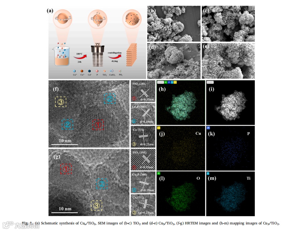 Cux/TiO2复合材料的制备流程如图1(a)所示,红磷的引入将有效实现TiO2表面Cu0和Cu+的价态调控。采用SEM对得到的样品形貌进行分析,其结果如图1(b-e)所示。纯的TiO2和复合样品都呈现出均匀的颗粒状且两者尺寸大小约为50 nm,表明Cu物种的加载没有明显改变TiO2的微观形貌。为进一步获得样品的详细微观结构信息,使用高分辨率透射电镜(HRTEM)对复合样品进行了表征。在图1(f)和(g)中检测到的0.35 nm的晶格条纹可以归因于TiO2的(101)晶面,而0.21 nm和0.19 nm的条纹间距则与Cu0的(111)晶面和Cu3P的(300)晶面息息相关。三种材料间存在良好的界面接触,这为后续的电子分离和传输提供了通路。图1(h-m)为元素分布图,显示了样品中的Cu、P、Ti和O元素均匀的分散于TiO2表面。