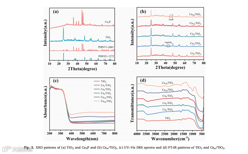 纯的TiO2和Cu3P的XRD谱图如图2(a)所示,从图中可以看到TiO2的2θ位于25.3°、48.0°、53.9°和55.0°的特征衍射峰。对于Cu3P材料,处于45.1°和46.2°的特征峰分别归属于(300)和(113)晶面。为了证实不同Cu物种在TiO2表面的成功负载,图2(b)展示了系列Cux/TiO2样品的XRD谱图。在Cu3/TiO2样品的XRD谱图中可以观察到位于43.3°的峰,这与Cu纳米颗粒的(111)晶面密切相关。同时,在Cu30/TiO2样品中可以看到属于Cu3P的特征峰,证实Cu+物种的成功引入。随着红磷用量的进一步增加,可以看到属于Cu纳米颗粒的峰正在慢慢减弱,表明Cu0物种的减少。相应的,Cu+物种的占比正随着红磷用量的增加而提高。这成功证明了利用红磷用量实现TiO2表面Cu元素的价态分布和比例调节的可行性。