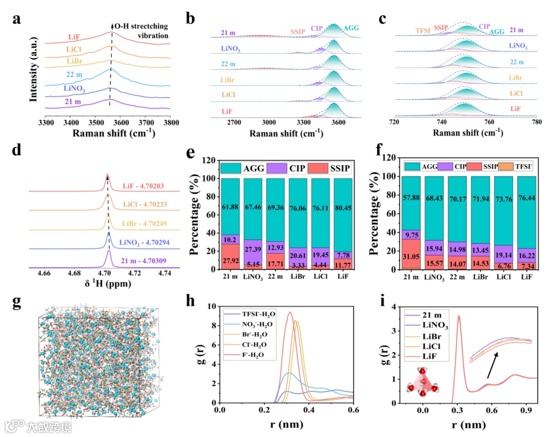 图2. 光谱测试和RDF计算。(a)电解质的拉曼光谱。(b-c)电解质在2700-3600 cm-1 (b)和720-780 cm-1(c)处的拉曼光谱。(d)电解质的1H NMR光谱。(e)AGG、CIP、SSIP在水分子网络中的比例。(f)TFSI、AGG、CIP、SSIP在Li-TFSI网络中的比例。(g)使用含有LiF的21 m LiTFSI的快照。(h)水分子中阴离子和氧原子之间的RDF。(i)不同水分子的氧原子之间的RDF。插图展示了水分子的四面体结构。