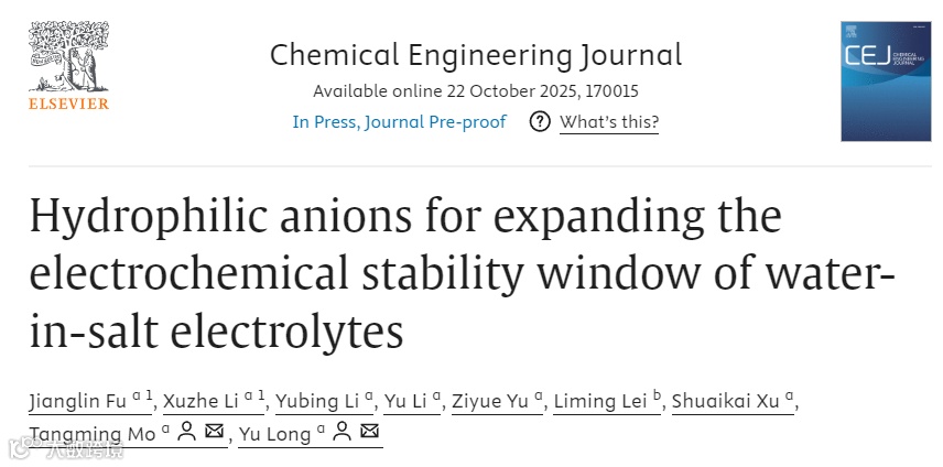 近日,广西大学龙雨教授团队在国际知名期刊Chemical Engineering Journal上发表题为“Hydrophilic anions for expanding the electrochemical stability window of water-in-salt electrolytes”的研究论文。该研究利用电化学测量、拉曼光谱、核磁共振和基于恒电势方法的分子动力学模拟,系统地研究了亲水性阴离子对盐包水电解质(WIS)的电化学稳定窗口(ESW)的影响。结果表明,亲水性阴离子显著地将电解液的ESW从3.04 V扩展到3.23 V。这种改善源于阴离子与水分子之间的强静电相互作用,促进了密集溶剂化壳的形成,提高了电解质界面的稳定性。具体来说,亲水性阴离子通过减少正极的水分子和改变负极的水分子取向来重新构筑电极界面。基于阴离子改性的电解质和商用电极材料YP50制备的对称超级电容器在1 A g-1的电流密度下循环10000次后,电容值为26.09 F g-1,提高23.71%,库仑效率保持在97%以上。该文通过阐明亲水性阴离子的作用机理,为高压水系电解质的设计提供了新的方案。