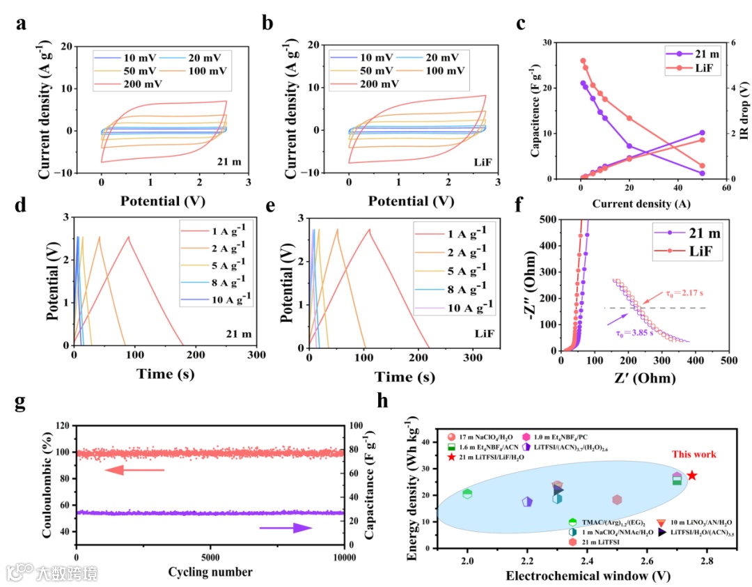 图4. 电化学性能测试。(a-b)不同扫描速率下21 m LiTFSI (a)和含LiF的21 m LiTFSI (b)的CV曲线。(c)不同电流密度下,21 m LiTFSI和含LiF的21 m LiTFSI的电容衰减和电压降。(d-e)不同电流密度下21 m LiTFSI (d)和含LiF的21 m LiTFSI (e)的GCD曲线。(f)电解质的EIS曲线。(g)含LiF的21 m LiTFSI的库仑效率和电容保持率。(h)本实验测试结果与其他相关文章测试结果的性能比较。