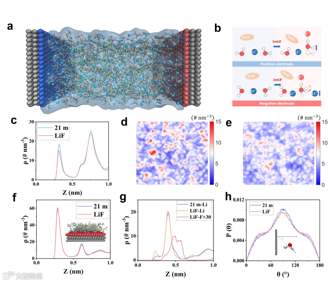 图3. 电极界面变化机理分析。(a)使用含LiF的21 m LiTFSI三维模型。(b)水分子和离子在正负极界面的示意图。(c)正极界面水分子的一维数密度比较。(d-e)21 m LiTFSI (d)和含LiF的21 m LiTFSI (e)在正极界面的二维水分子数密度分布。(f-g)水分子(f)和Li离子(g)在负极界面的一维数密度比较。(h)负极界面水分子取向比较。插图显示了水分子的取向。