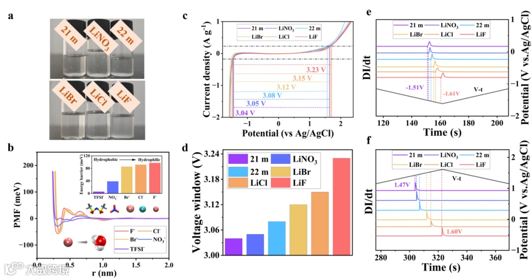 图1. 电解质制备和稳定性评价:阴离子亲水性表征和电化学稳定窗口测试。(a)21m LiTFSI和添加其他离子的21m LiTFSI。(b)阴离子和水分子之间的PMF。插图为21m LiTFSI和添加其他离子的21m LiTFSI的能垒图。(c)电解质在10mv s-1时的LSV曲线。(d)电解质的电化学稳定窗口。(e-f)正极(e)和负极(f)电解质在10mv s-1下的微分曲线。
