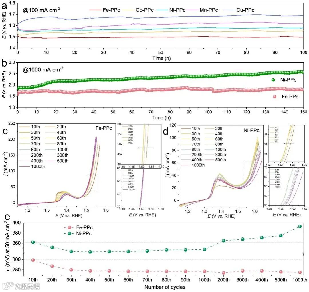 图6. a) 在恒定电流密度100 mA cm-2下的催化稳定性测试。b)在恒定电流密度1000 mA cm-2下的催化稳定性测试。c,d) 在1.0 M KOH中,经过不同次数CV循环后,催化剂在1.1-1.65 V vs RHE电压范围内的OER极化曲线。e) Fe-PPc和Ni-PPc在经历不同循环次数后,在50 mA cm-2电流密度下的过电位变化图。