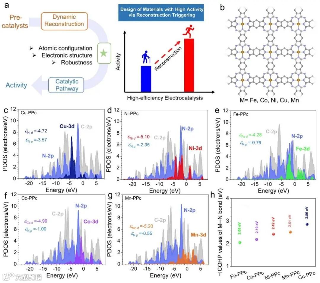 图1. 图1. a) 金属聚酞菁预催化剂中可调活性相重构示意图。b) M-PPc框架中重复单元的球棍模型,蓝色球= N,灰色球= C,橙黄色球= M。c-g) 的投影分波态密度。h) Cu-PPc、Ni-PPc、Fe-PPc、Co-PPc和Mn-PPc中M−N键的负积分COHP(-ICOHP)值。