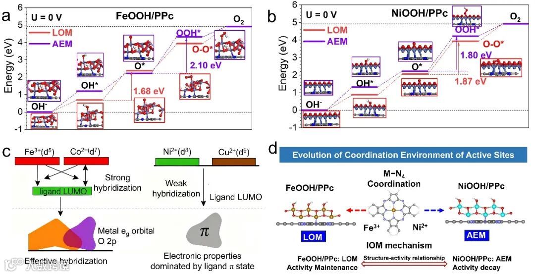 图8. (a) FeOOH/PPc、(b) NiOOH/PPc在U=0 V下的析氧反应反应趋势及对应吸附质演化机制、晶格氧机制的结构变化;(c) 金属酞菁中金属-配体轨道杂化示意图 (d) 析氧反应过程中金属酞菁(M-PPc)活性位点配位演化示意图,Fe-PPc重构为FeOOH(遵循LOM,活性保持),Ni-PPc形成NiOOH(遵循AEM,活性衰减)。