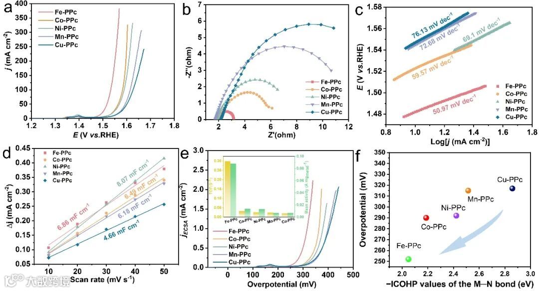 图4. 电催化OER性能评估。a) 负载于泡沫镍上的Fe-PPc、Co-PPc、Ni-PPc、Mn-PPc和Cu-PPc催化剂在1 M KOH中的IR校正极化曲线,b) 奈奎斯特图和c) 塔菲尔图。d) 负载于泡沫镍上的Fe-PPc、Co-PPc、Ni-PPc、Mn-PPc和Cu-PPc催化剂的Cdl。e) 根据ECSA和LSV结果计算的比电流密度(jECSA)。(插图:在300 mV过电位下,负载于泡沫镍上的Fe-PPc、Co-PPc、Ni-PPc、Mn-PPc和Cu-PPc催化剂的TOF和质量活性比较)。f) M─N键的−ICOHP值与OER过电位。