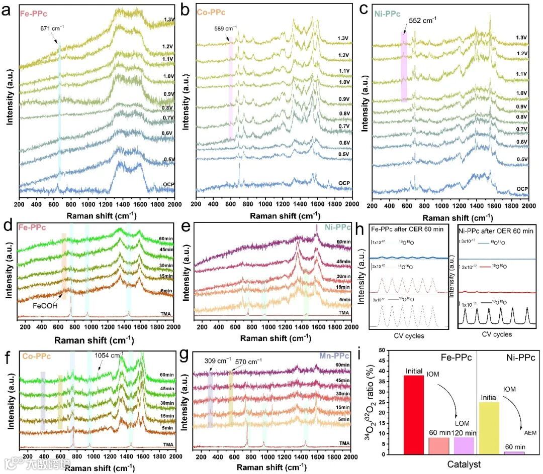 图7. a–c) 在不同电压下的原位拉曼光谱:Fe-PPc、Co-PPc、Ni-PPc。d–g) 在1.0 M TMAOH中恒电流测试后,催化剂表面的非原位拉曼光谱:Fe-PPc、Ni-PPc、Co-PPc、Mn-PPc。h, i) 在1.0 M KOH溶液CV过程中,Fe-PPc和Ni-PPc催化剂恒电流测试60分钟后,产生的32O2、34O2和36O2的时间分辨DEMS信号及其在CV测量期间相应的34O2/32O2和36O2/32O2比率。
