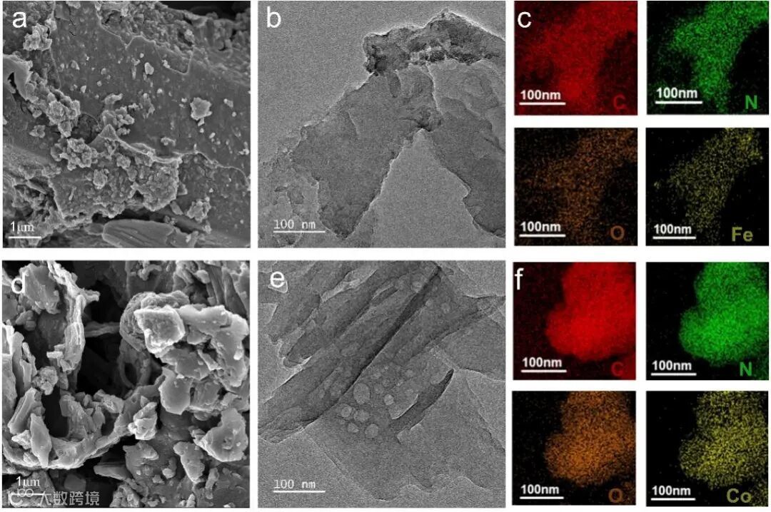 图3. 合成催化剂的形貌表征。a) Fe-PPc的SEM和b) TEM图像。c) Fe-PPc样品的高角环形暗场STEM图像及相应的C、N和Fe元素分布图。d) Co-PPc的SEM和e) TEM图像。f) Co-PPc样品的高角环形暗场STEM图像及相应的C、N和Co元素分布图。