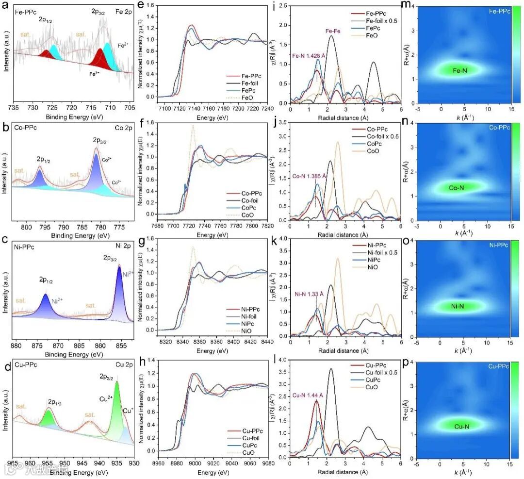 图2. (a) Fe-PPc的Fe 2p、(b) Co-PPc的Co 2p、(c) Ni-PPc的Ni 2p、(d) Cu-PPc的Cu 2p高分辨XPS谱图;(e) Fe-PPc、(f) Co-PPc、(g) Ni-PPc、(h) Cu-PPc的元素K边XANES谱;(i) Fe-PPc、(j) Co-PPc、(k) Ni-PPc、(l) Cu-PPc 的含相移k2加权X射线吸收精细结构(EXAFS)傅里叶变换谱;(m) Fe-PPc、(n) Co-PPc、(o) Ni-PPc、(p) Cu-PPc 的 EXAFS 谱小波变换图。