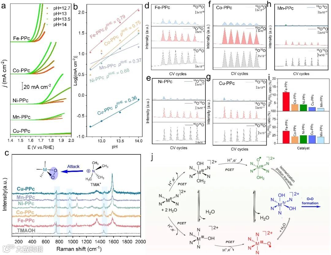 图5. a) 在不同pH值的KOH溶液中测得的LSV曲线。b) 在1.7 V vs RHE下比电流密度随pH的变化。c) 在1 mol L⁻¹ TMAOH溶液中测试后催化剂的拉曼光谱。d–i) 在1.0 M KOH溶液CV过程中,催化剂产生的³²O₂、³⁴O₂和³⁶O₂的时间分辨DEMS信号及其在CV测量期间相应的³⁴O₂/³²O₂和³⁶O₂/³²O₂比率。j) 在碱性条件下M-PPc催化剂提出的分子内氧耦合机制(IOM)。