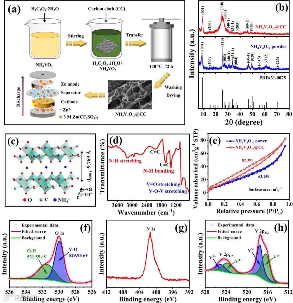 图2 (a)NVO@CC制备过程的示意图;(b)NVO粉末与NVO@CC的XRD图谱;(c)NVO的晶体结构示意图;(d)NVO@CC的傅里叶变换红外光谱(FTIR);(e)NVO粉末与NVO@CC的氮气吸附-脱附等温线曲线;(f)、(g)和(h)分别为O 1s、N 1s和V 2p的高分辨率XPS光谱图。
