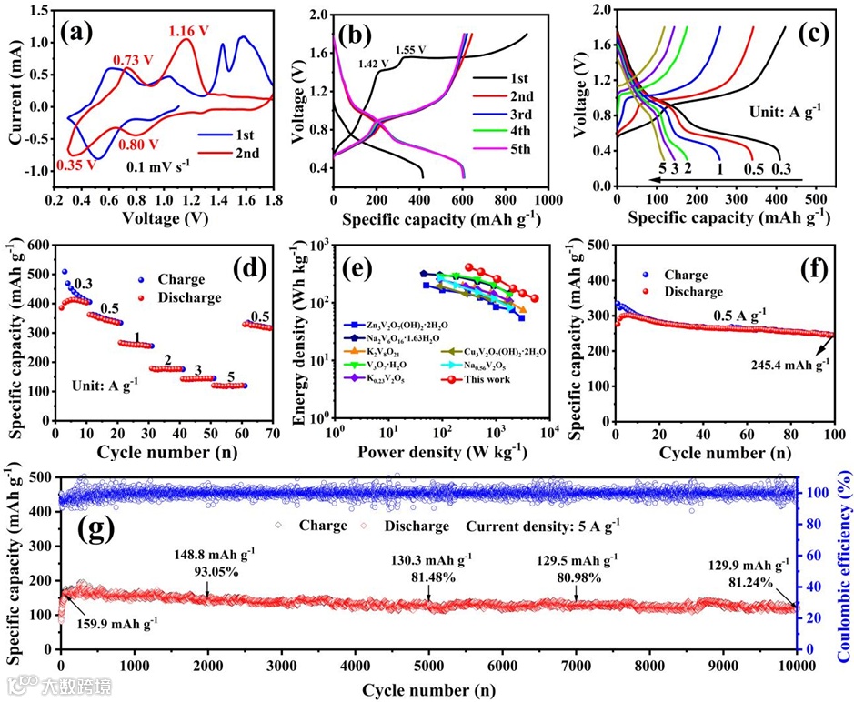 (2)在高电流密度5 A g-1下进行长时间循环,仍可在10000圈后保持129.9 mAh g-1的容量,容量保持率达81.24%,展现出卓越的结构稳定性与反应可逆性;