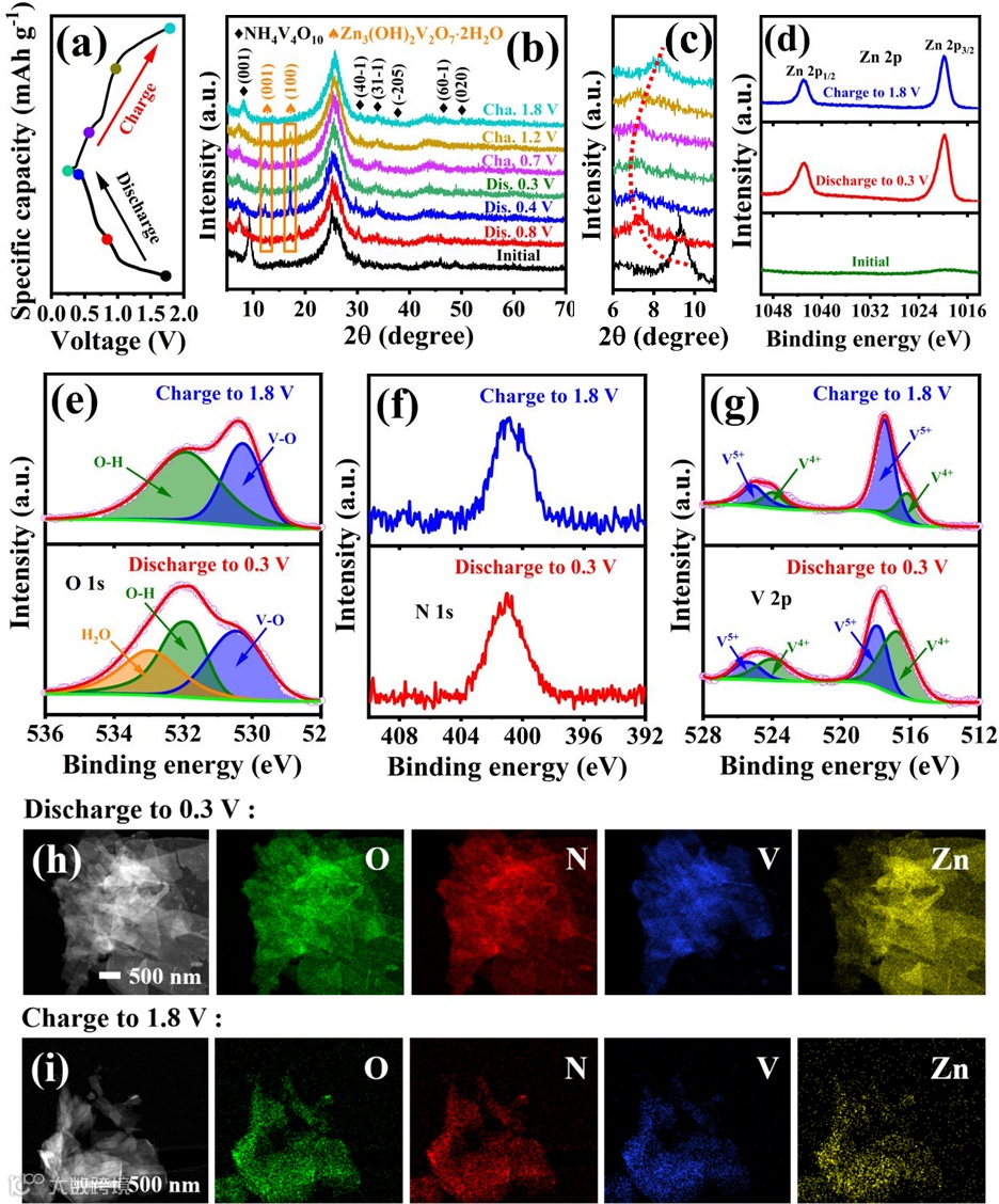图 5 (a)NH4V4O10@CC电极在 0.1 A g-1下首次循环的充放电曲线;(b)在不同充放电状态下的原位(Ex-situ)XRD图谱;(c)是(b)中XRD图谱的放大视图;(d)在初始态、完全放电态和完全充电态下的Zn 2p高分辨率XPS光谱;(e)、(f)和(g)在完全放电态与完全充电态下的O 1s、N 1s 和 V 2p 的高分辨率XPS光谱;(h)和(i)分别为在完全充电态和完全放电态下的TEM元素分布图。