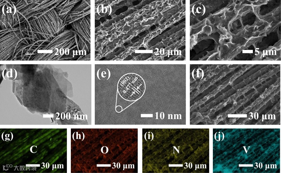 图3 (a)、(b)和(c)NVO@CC的SEM与高分辨扫描电镜(HRSEM)图像;(d)、(e)、(f)和(g)分别为NVO@CC的透射电镜(TEM)、高分辨透射电镜(HRTEM)图像及其对应的元素分布图。