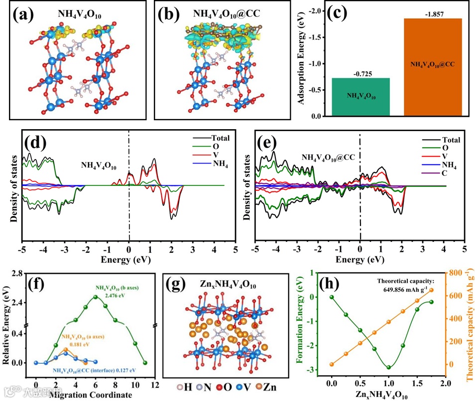 图1 NVO与NVO@CC的DFT模拟结果。(a)和(b)NVO与NVO@CC的电荷密度差分图;(c)NVO与NVO@CC插入Zn²⁺后的吸附能对比;(d)和(e)NVO与NVO@CC的态密度分布;(f)Zn²⁺在NVO(沿a轴和b轴方向)和NVO@CC(沿界面方向)中的扩散能垒;(g)Zn²⁺插入后NVO的结构示意图;(h)基于Zn²⁺插入形成能计算得到的NVO理论容量。