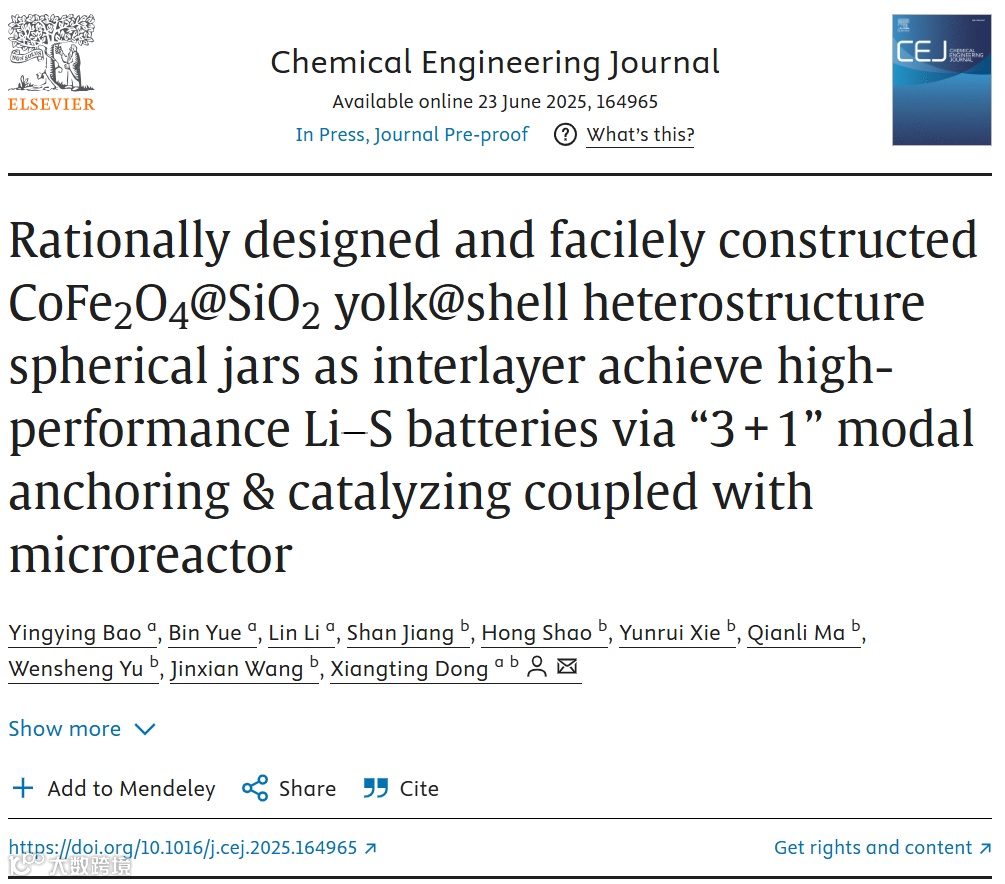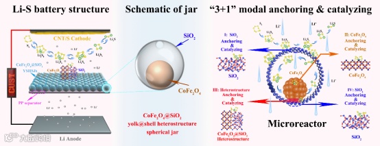 合理设计构建 CoFe2O4@SiO2 蛋黄@蛋壳异质结构球形罐作为中间层,通过“3 + 1”模式锚定与催化作用耦合微反应器实现高性能的锂硫电池