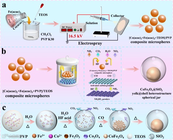 2. 温度升高阶段:过量NH4HF2分解释放气体,HF与水蒸气反应形成氢氟酸,催化TEOS水解形成致密SiO2壳,强化蛋黄@壳结构。乙酰丙酮盐和PVP分解,复合微球收缩形成空隙,挥发性气体使内部压力升高,气体逸出形成球形罐状结构。乙酰丙酮盐高温分解产生Co3O4和Fe2O3,高温下进一步反应形成CoFe2O4微粒。