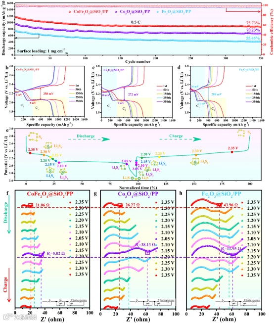3. yolk@shell微反应器有助于延长多硫化物停留时间,且能够有效提升LiPSs与反应器内活性位点的碰撞几率,增强CoFe2O4@SiO2 YSHSJs的锚定和催化效果。