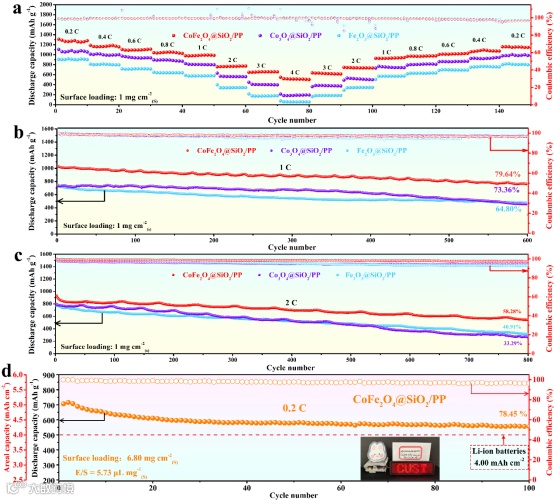 电化学性能的显著优势,有力地彰显了CoFe2O4@SiO2 YSHSJs基于成分与结构设计所衍生出的锚定与催化双重协同作用的有效性,凸显了该设计策略在提升电池性能方面的关键作用。