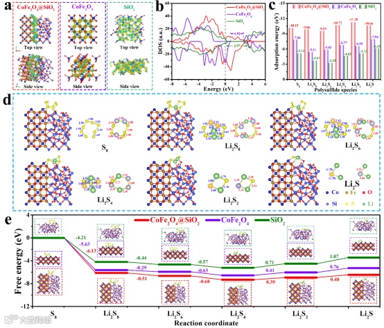 图7. DFT计算(a) 差分电荷密度,(b) 态密度,(c) 对不同多硫化物的吸附能,(d) CoFe2O4@SiO2 异质结构对不同多硫化物吸附的位点分析和 (e) 不同催化剂对多硫化物转化反应的吉布斯自由能变。