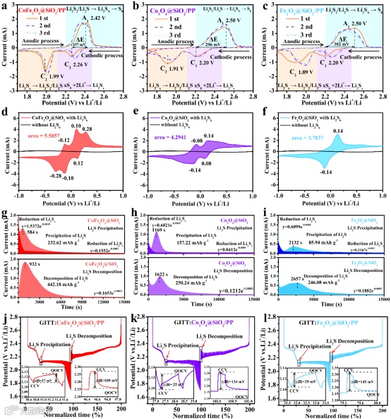 图4. 不同改性隔膜装配的锂硫电池的CV测试曲线(a-c),对称电池的CV测试曲线(d-f),Li2S沉积和分解测试曲线(g-i),GITT测试曲线(j-l)。