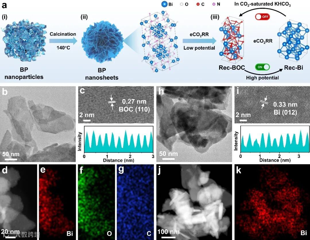 图1. 自更新Bi基催化剂的设计思路及透射电镜表征。