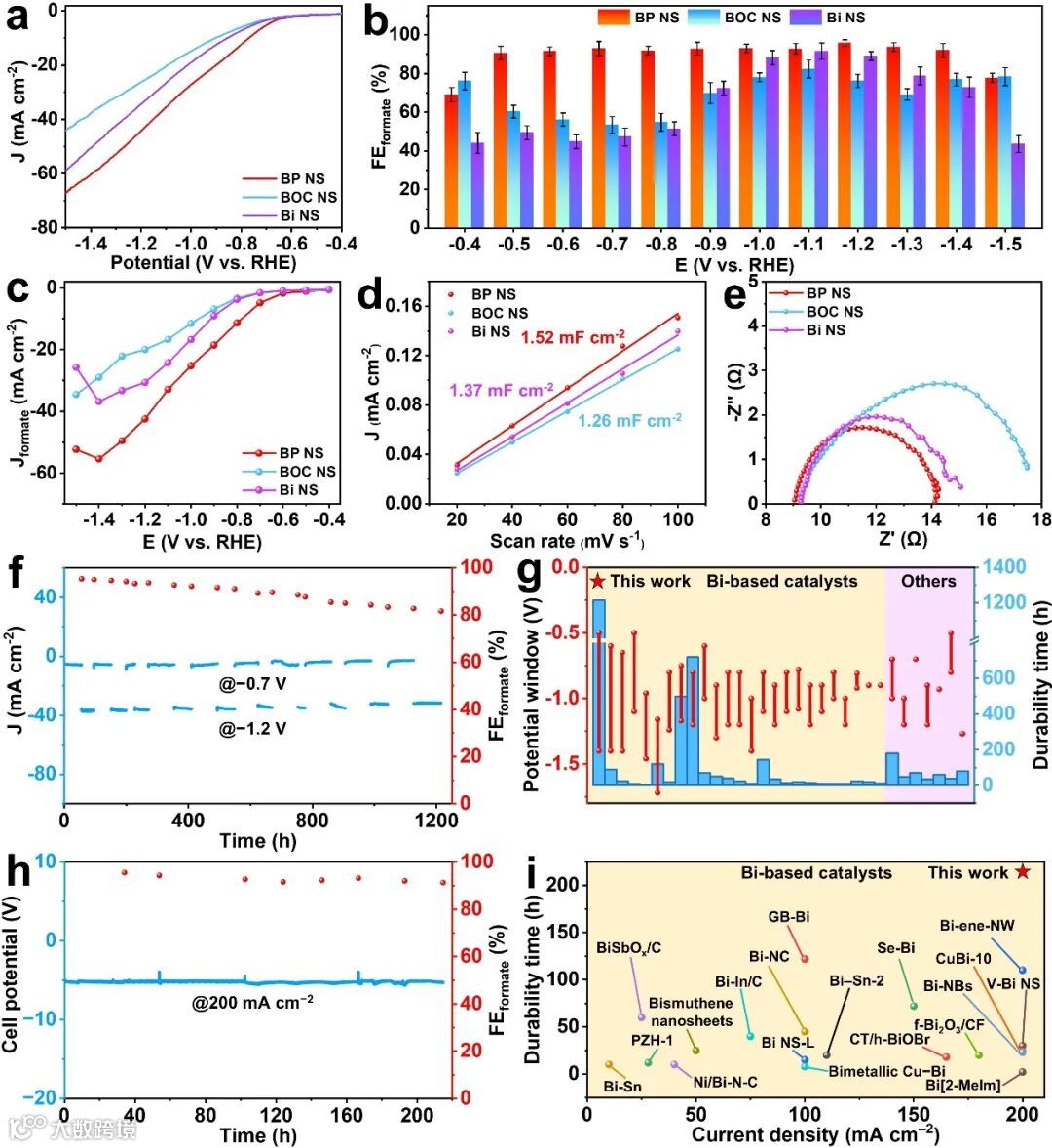 图2. 自更新Bi基催化剂的eCO2RR性能测试。