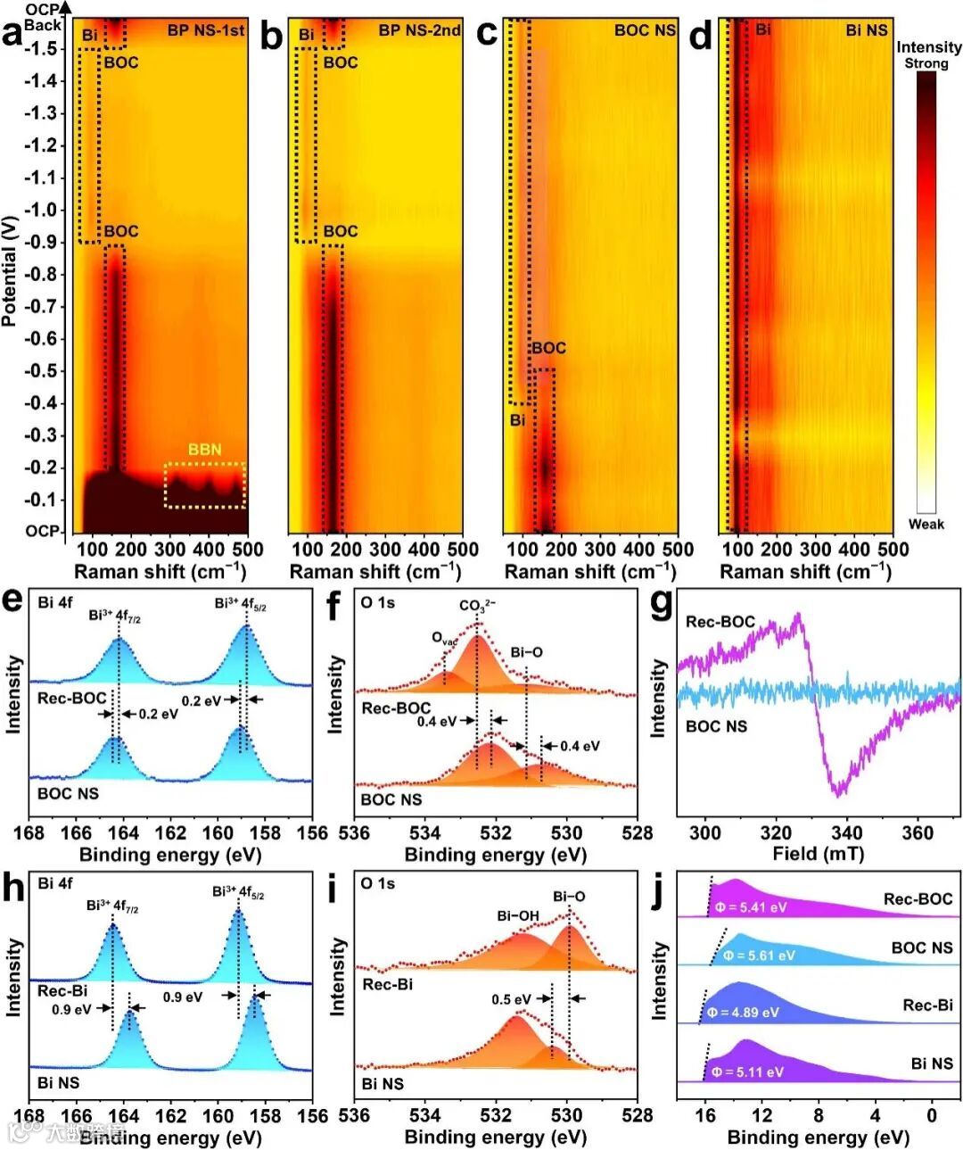 原位拉曼光谱进一步证实了该Bi基催化剂的“自更新”性质,在低电位下(< −0.9 V),BBN预催化剂的特征峰快速转变为Bi2O2CO3的特征峰,证明BBN到Bi2O2CO3的相转变。在高电位下(> −0.9 V),Bi2O2CO3会被进一步还原为金属Bi。当停止反应后,金属Bi又会被电解液中的CO2氧化,重构为Bi2O2CO3,并且第二次测试仍展现出相同的变化趋势,证明其具有“自更新”特性。而自制的金属Bi纳米片和Bi2O2CO3纳米片,则不能在反应停止后,自发地由金属Bi相转变回Bi2O2CO3相。X射线光电子能谱表明,由BBN预催化剂转变得到的金属Bi与自制的金属Bi纳米片相比,具有更多的表面氧,这是其能够自发地从金属Bi转变为Bi2O2CO3的关键。
