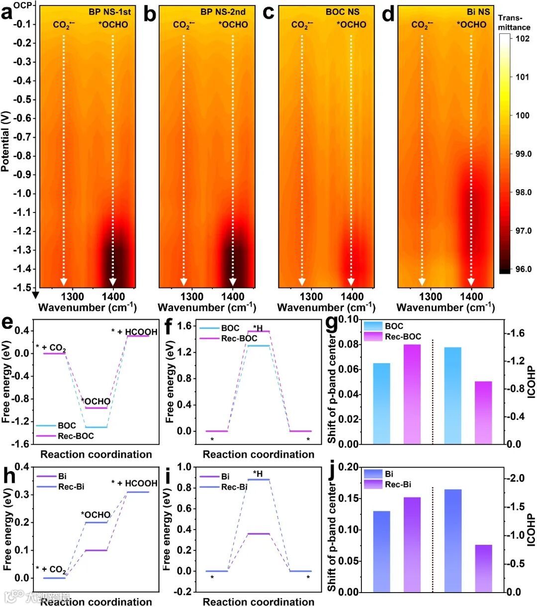 原位红外测试表明,BBN预催化剂展现出更强的中间体吸附信号,证明其能够实现快速的CO2→ CO2•− → *OCHO → HCOOH转化。密度泛函理论计算表明,重构得到的真实Bi2O2CO3位点(具有氧空位)和金属Bi位点(具有表面氧结构),相比于普通的Bi2O2CO3和金属Bi,展现出优化的反应中间体吸附性质,从而具有更优异的eCO2RR性能,这也是该催化剂能够在−0.5V至−1.4 V的宽电位范围内展现出高选择性的重要原因。