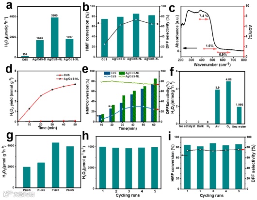 图3. 所制备样品的光催化性能。(a)不同样品的H₂O₂合成光催化性能;(b)不同样品对应的HMF转化率和DFF选择性;(c)Ag/CdS-NL上H₂O₂生成的表观量子产率(AQY)与波长的关系;(d)在5 mM HMF水溶液中,催化剂质量浓度为5 mg/5 mL、50 W蓝光LED灯(λ=450 nm)照射下,CdS和Ag/CdS-NL催化剂上H₂O₂的时间依赖性光催化生成曲线;(e)同上条件下的HMF转化率和DFF选择性;(f)Ag/CdS-NL在不同条件下的H₂O₂光催化生成活性;(g)Ag/CdS在不同pH值下的H₂O₂光催化生成活性;(h)Ag/CdS-NL的H₂O₂生成循环性能;(i)Ag/CdS-NL的HMF转化率和DFF选择性循环性能。