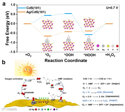 密度泛函理论(DFT)计算表明,在*OOH中间体的形成过程中,Ag/CdS(101)的自由能低于CdS,说明Ag团簇能有效降低*OOH形成的能垒,这是2e⁻ ORR生成H₂O₂的关键步骤。该过程会抑制・O₂⁻和・OH的产生,从而提高HMF氧化生成DFF的选择性。