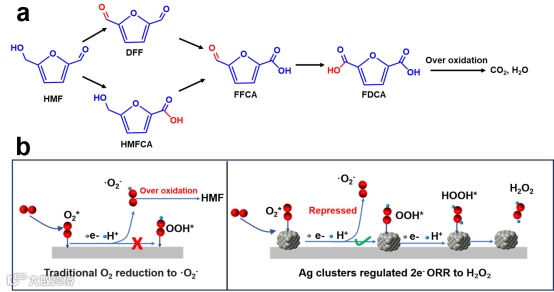 图1. (a) 5-羟甲基糠醛(HMF)氧化的主要可能产物示意图。(b) 氧气(O₂)还原路径调控示意图。