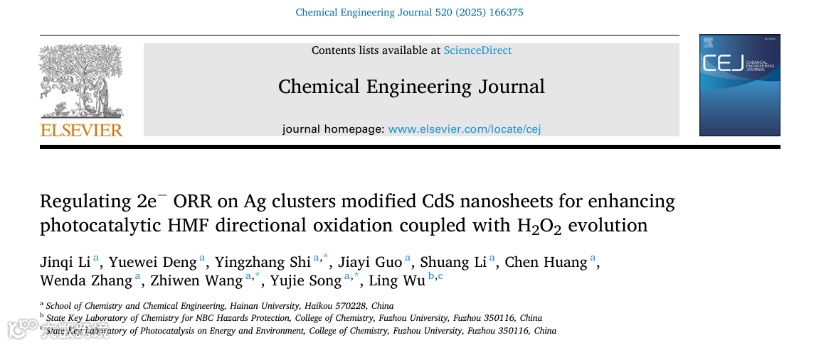 近日,来自海南大学的宋玉洁副教授和时应章副研究员,在国际知名期刊Chemical Engineering Journal上发表题目为”Regulating 2e- ORR on Ag Clusters Modified CdS Nanosheets for Enhancing Photocatalytic HMF directional Oxidation Coupled with H2O2 Evolution”的研究性文章。改文章在自然光的辅助下,构建了Ag团簇(2.86 nm)修饰的CdS纳米片,通过调控2e⁻ ORR生成H2O2的路径,抑制了活性氧自由基的产生,实现了光催化HMF定向氧化耦合产H2O2。