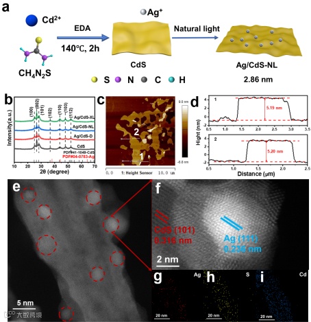 图1. (a) Ag/CdS-NL的合成示意图,(b) x射线衍射图,2θ从10°到70°,(c)Ag/CdS-NL的原子力显微镜图像,(d) (c)中相应的线轮廓,HAADF-STEM像差校正图像(e, f)和Ag/CdS-NL相应的元素映射(g-i)。