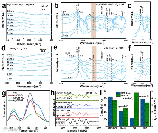 图4. Ag/CdS-NL(a)和CdS(d)在黑暗条件下的原位漫反射红外光谱,以及光照条件下生成H₂O₂的中间体和HMF选择性氧化为DFF官能团变化(b、e)。(b)和(e)的局部放大图(c、f)。所制备样品的氧气程序升温脱附(O₂-TPD)谱图(g)。所制备样品在黑暗和光照条件下用DMPO进行的EPR自旋捕获实验(h)。(i)在不同捕获剂下,在Ag/CdS-NL催化剂上H₂O₂产生速率、HMF转化率及DFF选择性。