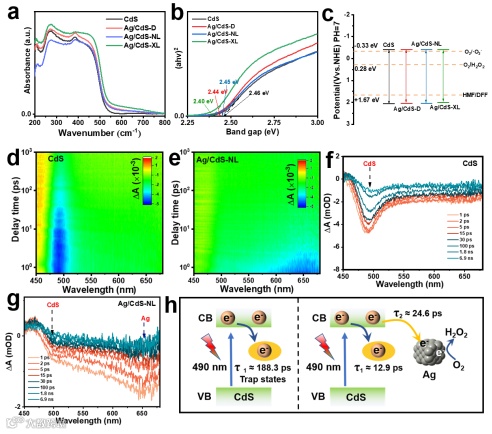 图2. 所制备样品的光电化学性能。所制备样品的紫外-可见漫反射光谱(UV–vis DRS)(a);(b)对应的(αhν)²与Eg的关系图;(c)能级图;(d)CdS和(e)Ag/CdS-NL复合材料的伪彩色图(GSB代表基态漂白);(f)CdS和(g)Ag/CdS-NL的飞秒瞬态吸收光谱;(h)CdS和Ag/CdS中电子猝灭动力学示意图。
