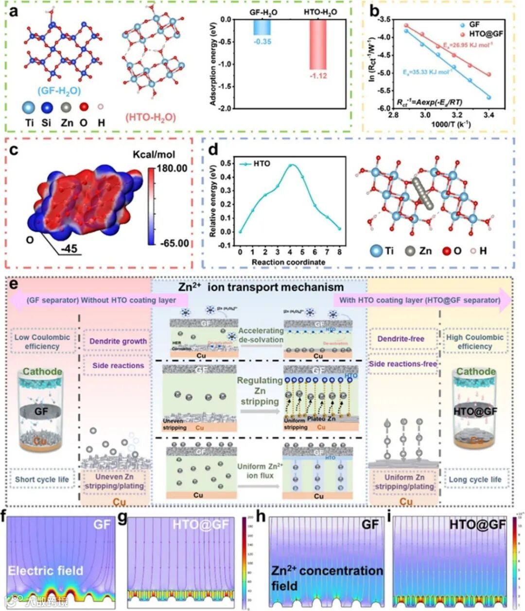 图2. HTO@GF隔膜中Zn²⁺离子传输机制研究。(a)GF与HTO对水分子的吸附能计算结果。(b)基于Zn||Cu非对称电池的阿伦尼乌斯曲线及对应的Zn²⁺去溶剂化活化能。(c)HTO材料的静电势分布图。(d)HTO涂层中Zn²⁺的扩散路径及其对应的扩散能垒的DFT计算结果。(e)HTO@GF隔膜中Zn²⁺传输机制示意图。(f、g)基于GF隔膜与HTO@GF隔膜的电场分布模型。(h、i)基于GF隔膜与HTO@GF隔膜的Zn²⁺浓度场分布模型。
