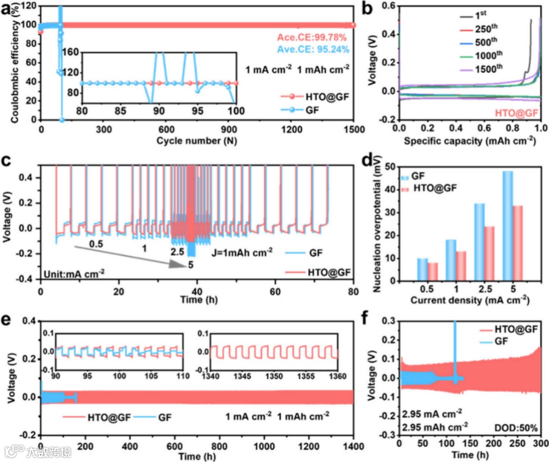 图4. 在对称电池与非对称电池中评估HTO@GF隔膜的电化学性能。(a) 在1 mA cm⁻²电流密度与1 mAh cm⁻²容量条件下,采用GF与HTO@GF隔膜的Zn||Cu非对称电池的长周期循环性能对比。(b) 不同循环周期下,HTO@GF隔膜组Zn||Cu非对称电池的电压-容量曲线。(c) 采用HTO和HTO@GF隔膜的Zn||Cu非对称电池在不同电流密度下的倍率性能。(d) 采用HTO和HTO@GF隔膜的Zn||Cu非对称电池在不同电流密度下的成核过电位比较。(e) 在1 mA cm⁻²电流密度与1 mAh cm⁻²容量条件下,采用GF与HTO@GF隔膜的Zn||Zn对称电池的电压-时间曲线。(f) 在50% DOD_Zn条件下循环的Zn||Zn对称电池的电压曲线。