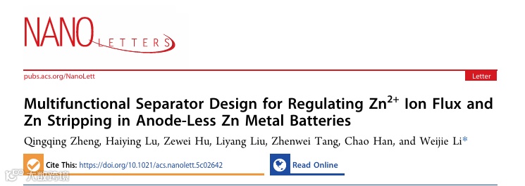 近日,来自中南大学的李维杰教授在国际知名期刊Nano Letters上发表题为“Multifunctional Separator Design for Regulating Zn2+ Ion Flux and Zn Stripping in Anode-Less Zn Metal Batteries”的观点文章。文章创新性地设计并制备了一种功能化复合隔膜(HTO@GF),该隔膜通过简单的滴涂法将具有大层间距和强锌亲和力的水合钛酸盐(HTO)负载于玻璃纤维隔膜(GF)表面。HTO中的高电负性氧原子能够有效吸引电子,促进锌金属电子脱出,从而调控锌的剥离过程。同时,HTO优异的吸水性能加速了Zn²⁺离子的脱溶剂化过程,其层状结构为Zn²⁺提供快速且均匀的扩散通道,有效引导锌离子均匀沉积,抑制枝晶生长和“死锌”形成。实验结果表明,采用HTO@GF隔膜的Zn||Cu半电池实现了高达99.78%的库仑效率,且稳定运行超过1500个充放电周期。全电池体系(Zu||NVO)在N/P比为3的条件下,展现出长达800次循环的优异循环寿命。该研究不仅系统揭示了隔膜界面对锌剥离行为的调控机制,也突显了隔膜工程在提升无负极锌金属电池性能中的重要作用,为未来高性能、安全、长寿命锌金属电池的开发提供了宝贵的理论基础和技术支撑。
