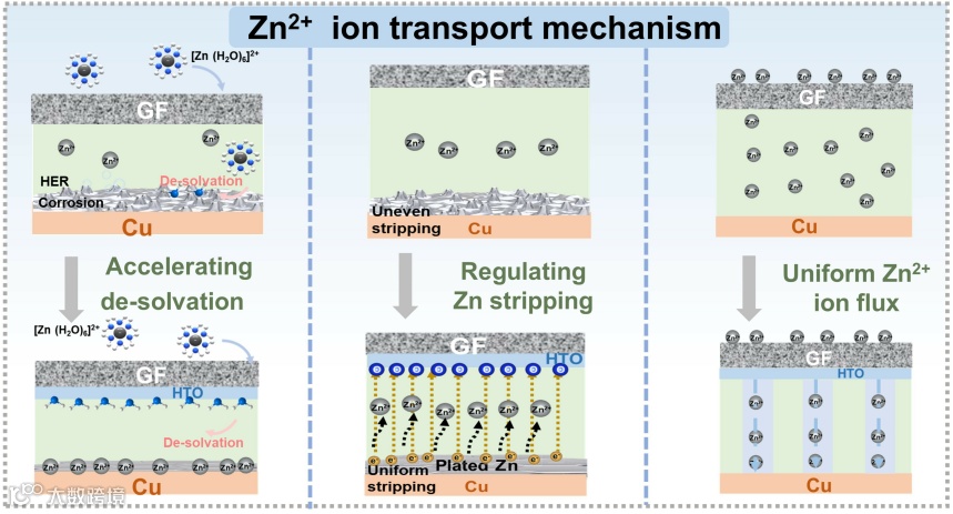 示意图1 HTO@GF 隔膜调控 Zn²⁺离子传输机制的示意图