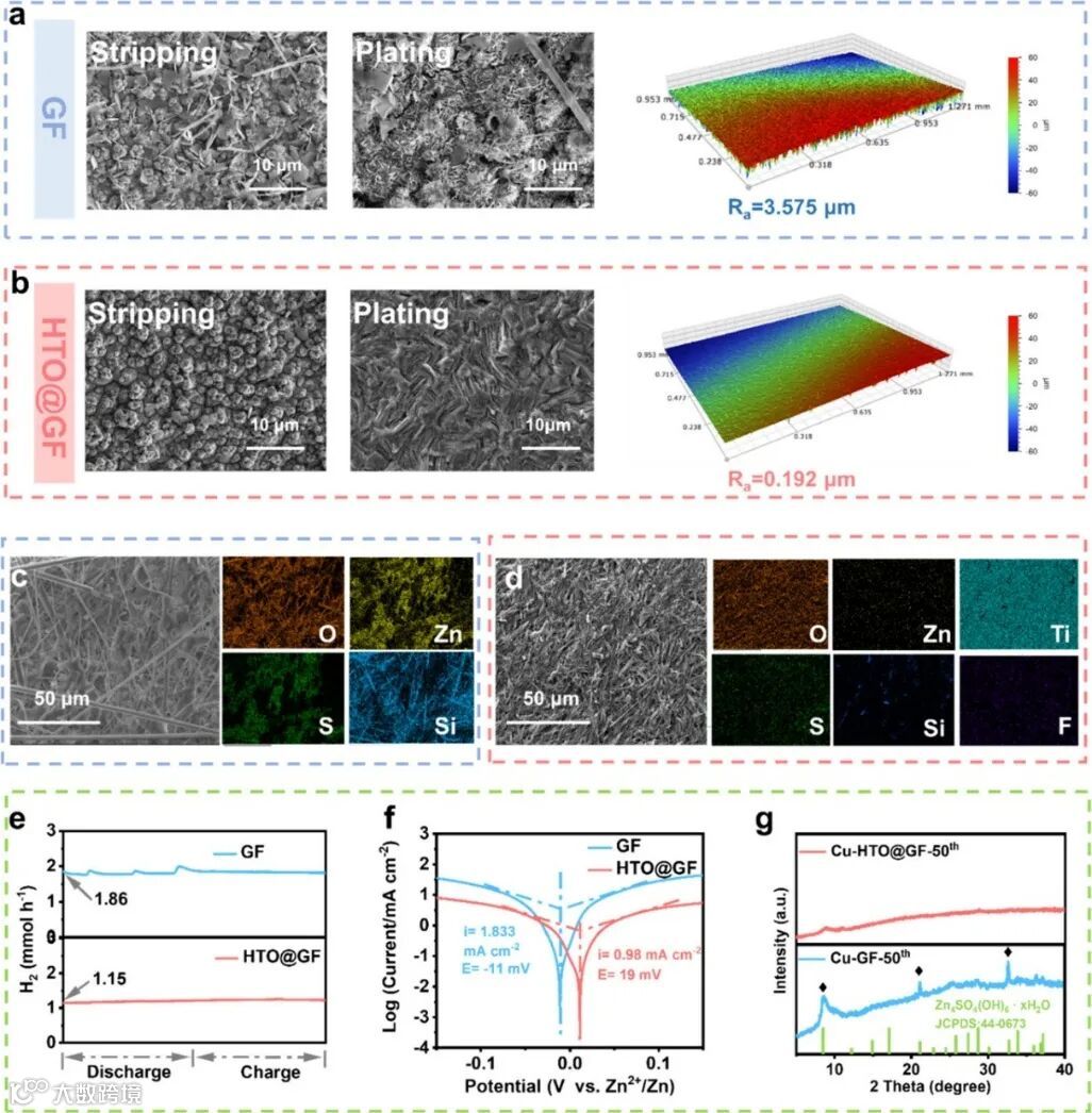 图3. 对Zn沉积/剥离形貌及副反应抑制能力的影响。(a, b) 采用GF和HTO@GF隔膜的Zn||Cu非对称电池在1 mA cm⁻²、1 mAh cm⁻²条件下循环50圈后的顶部SEM图像及表面轮廓仪图像;(c, d) GF与HTO@GF隔膜循环50圈后的EDS元素分布图;(e) GF和HTO@GF隔膜下Zn||Cu非对称电池在1 mA cm⁻²、截止容量1 mAh cm⁻²条件下的DEMS测试结果;(f) 使用GF和HTO@GF隔膜的Zn||Zn对称电池的Tafel曲线;(g) GF和HTO@GF隔膜下Cu电极在1 mA cm⁻²、1 mAh cm⁻²条件循环50圈后的XRD图谱